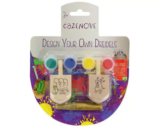 Two blank wooden dreidels suitable for decorating. Comes with three small tubs of paint and a brush. On a blister card.
